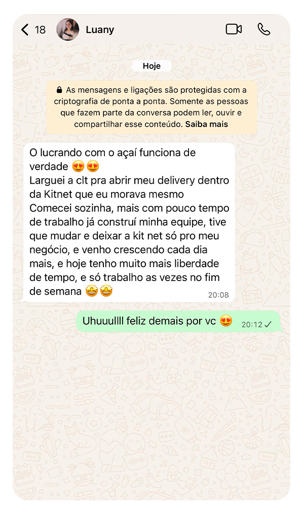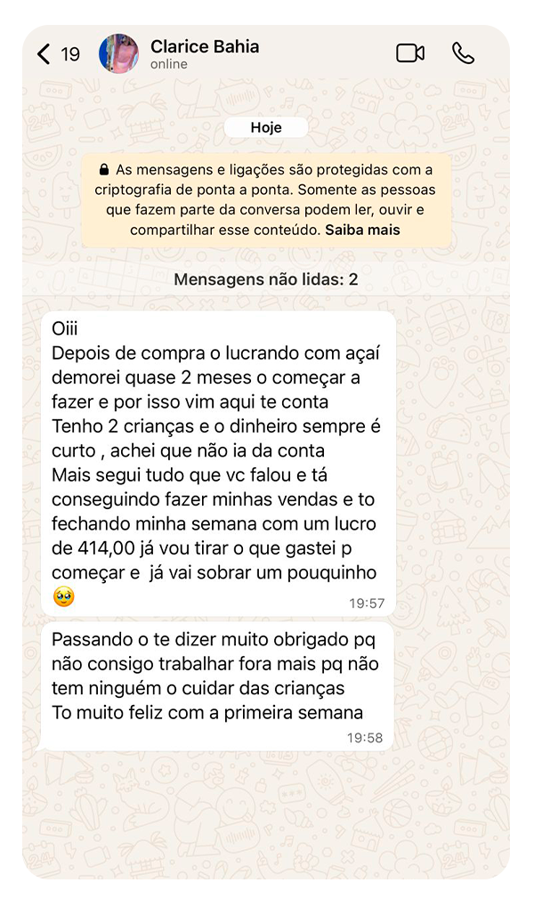 Comecei com os pés no chão de cimento da despensa da minha sogra, pesando tudo em uma balança doméstica e virando noites no liquidificador ao lado do meu marido. Em 2011, abrimos nossa pequena lojinha de açaí sem estrutura, sem sobra de dinheiro, mas com uma vontade gigante de dar certo e foi no meio dos erros e improvisos que nasceu a força para construir o que temos hoje: uma fábrica estruturada que abastece deliverys e sorveterias, além de mentorias que já ajudaram dezenas de pessoas a tirarem renda da própria cozinha. A virada veio quando entendi que não era sobre esperar o cenário ideal, mas sobre fazer com o que se tem e criar um sistema simples, inteligente e lucrativo, como a Alavanca do Copo Congelado. Hoje, minha missão é mostrar que você não precisa de ponto comercial, nem de investimentos altos para transformar potes de açaí em lucro toda semana. Basta dar o primeiro passo do seu jeito, no seu ritmo, direto da sua casa.